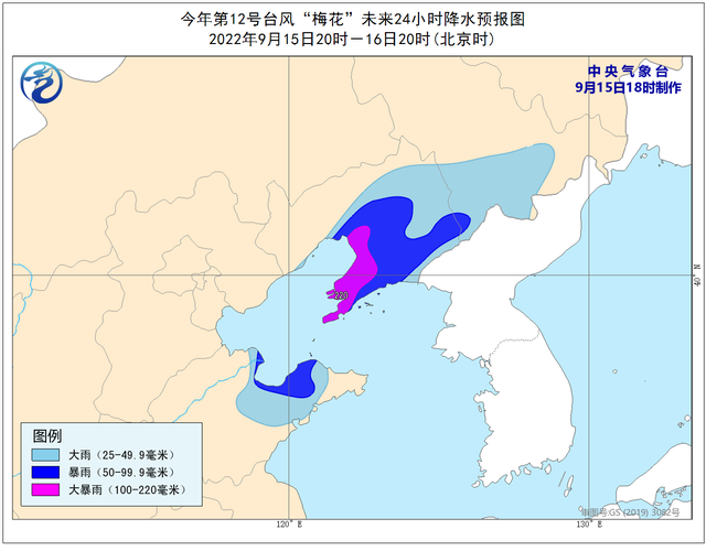 在台风影响下,辽宁、吉林、黑龙江等地部分地区将有强风雨出现。中央气象台预计,15日20时至16日20时,山东半岛北部、辽宁中东部、吉林东南部等地有大到暴雨,其中,辽宁东部和南部等地部分地区有大暴雨(100~220毫米)。17日,“梅花”的风雨影响趋于结束。