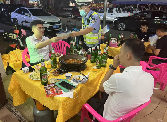 活动中,宣传人员来到食肆、大排档等涉酒场所,口头提醒就餐群众不要酒后驾车,并通过派发酒驾宣传单张、张贴海报和台卡等方式,向群众宣传酒驾醉驾的危害性,劝导大家要坚决拒绝酒驾醉驾违法行为,养成“喝酒不开车,开车不喝酒”自觉性,做到守法驾驶、安全出行。沿路的店家、群众对交警劝阻酒驾宣传工作均大力支持,纷纷表示要争当劝阻酒驾宣传员,同时提醒身边亲人朋友要拒绝酒后驾驶。