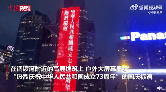 在铜锣湾附近的高层建筑上,户外大屏幕显示“热烈庆祝中华人民共和国成立73周年”的国庆标语。