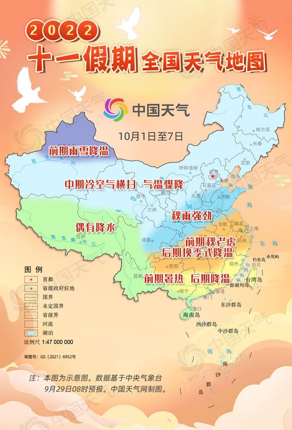 中国天气网讯 国庆假期即将开启,这个假期天气有点复杂,一股强冷空气将席卷全国大部地区,北方气温骤降,南方将上演冷热大反转,气温由罕见偏高转为明显偏低,四川黄淮等地秋雨强劲。中国天气网推出十一假期全国天气地图,提醒大家出行前关注天气预报,提前做好准备。#十一假期天气地图#
