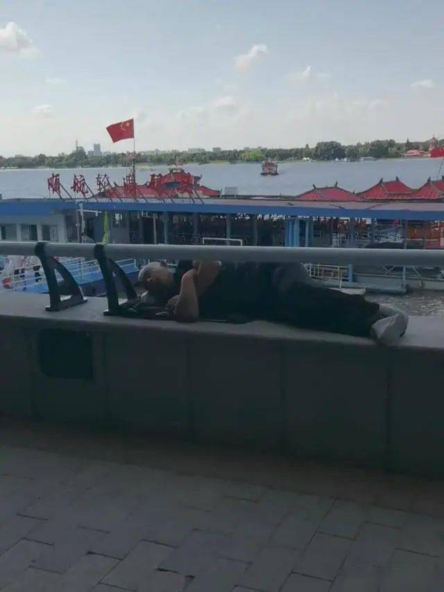 其次,注意这个老大爷是躺在石阶长板凳上,确实有护栏。但是谁都不能预见会不会发生意外,一个不小心,他就可能滚落到江里,后果也是相当严重。