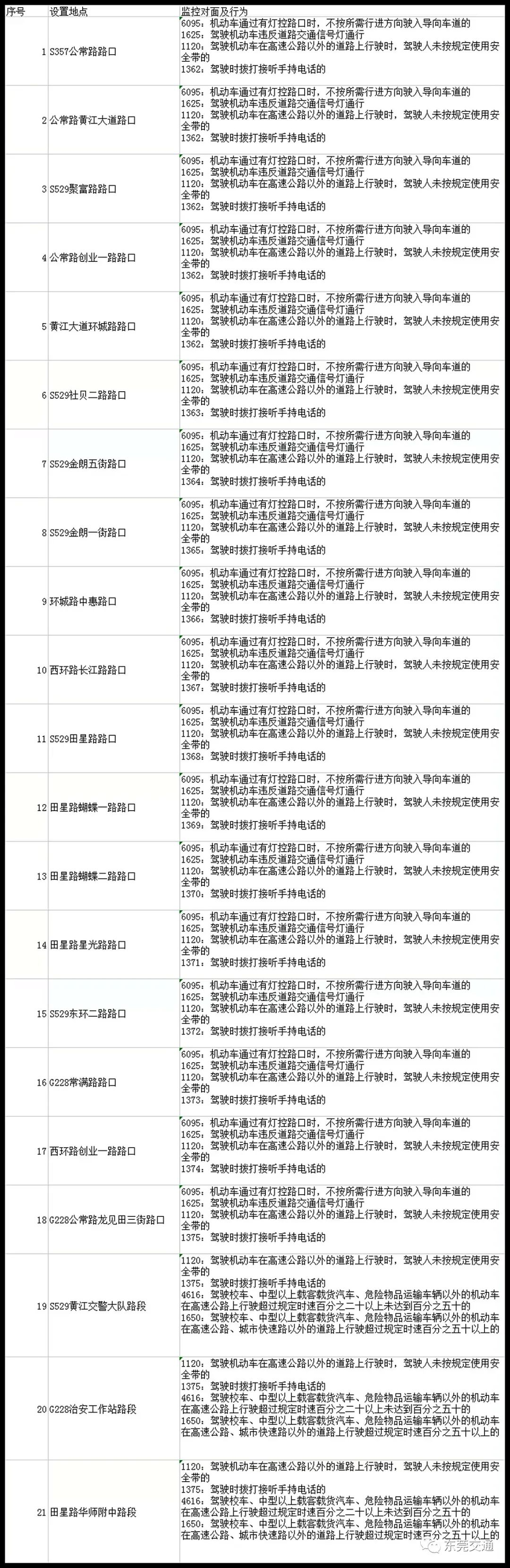 以上路口、路段的电子警察监控设备将在今年4月27日零时正式启用,实施24小时全天候电子警察抓拍违法行为。(来源:东莞交通)