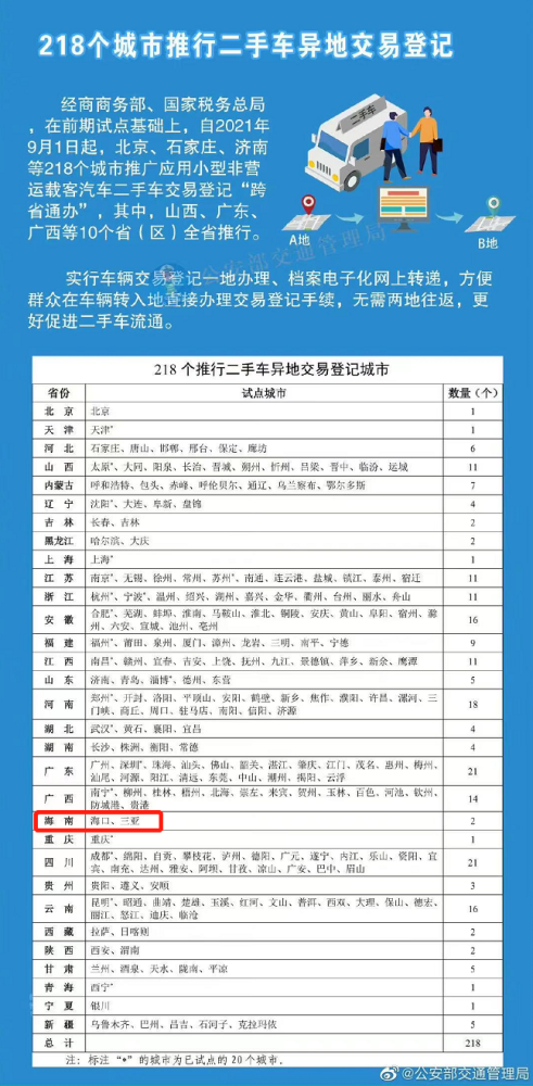 9月1日起,公安部将在全国218个城市推行二手车异地交易登记“跨省通办”,海南省海口市、三亚市将如期同步推行。