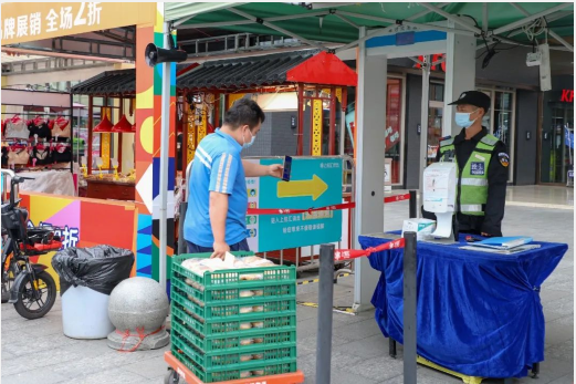 记者在上悦汇商场看到,在商场入口处设置了体温检测门,并摆放了消毒液、口罩等物品供有需要的市民使用;同时也安排了工作人员在门口提醒市民戴好口罩、测体温、扫场所码进场。