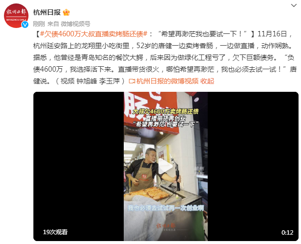 11月16日,杭州延安路上的龙翔里小吃街里,52岁的唐健一边卖烤香肠,一边做直播,动作娴熟。据悉,他曾经是青岛知名的餐饮大鳄,后来因为做绿化工程亏了,欠下巨额债务。“负债4600万,我选择活下来。直播带货很火,哪怕希望再渺茫,我也必须去试一试!”唐健说。