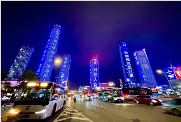 随着夜色到来,民盈·国贸中心、东莞环球经贸中心、东莞农商银行大厦、东莞嘉宏振兴中心、南城总部基地、滨海湾新区青创广场等东莞地标性建筑外墙一道道标语照亮夜空。“每个人都是自己健康的第一责任人”“打疫苗戴口罩勤洗手常通风,共同筑牢疫情防控安全防线”“科学规范戴口罩,文明健康益处多”“做好个人防护,对自己负责,对家人负责,对他人负责。”“做好自身健康第一责任人,守好疫情防控第一道防线。”“坚持疫苗接种‘应接尽接’,筑牢全民免疫屏障。”等标语轮番在高楼外墙、户外电子屏等场所播放,倡导市民群众戴口罩,打疫苗,做好个人防护,助力全市疫情防控工作。