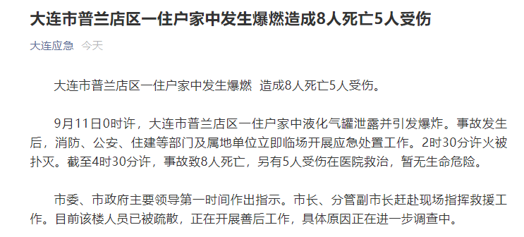 据“大连应急”微信公众号消息,9月11日0时许,辽宁省大连市普兰店区一住户家中液化气罐泄露并引发爆炸。事故发生后,大连消防、公安、住建等部门及属地单位立即临场开展应急处置工作。2时30分许,火被扑灭。截至4时30分许,事故致8人死亡,另有5人受伤在医院救治,暂无生命危险。