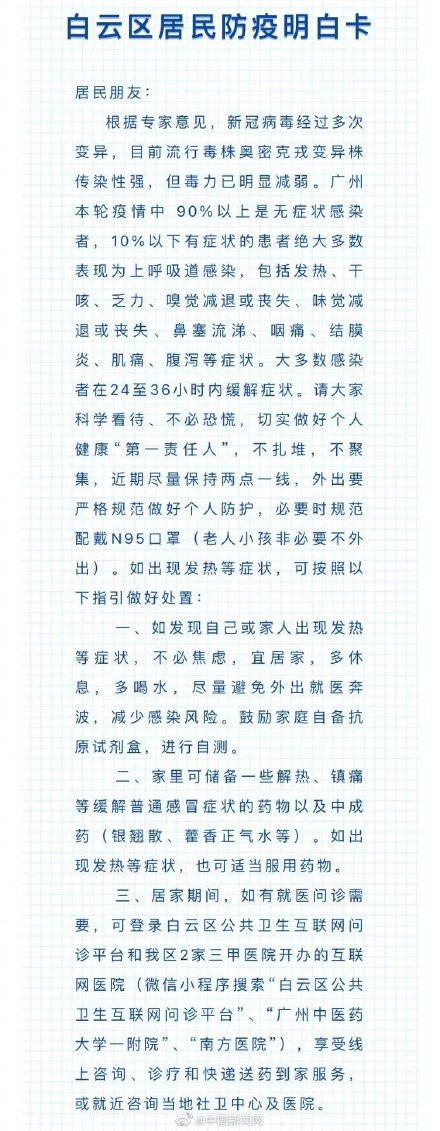 4日,“健康白云”发布“防疫明白卡”,“防疫明白卡”指出,如出现发热等症状,可按照以下指引做好处置: