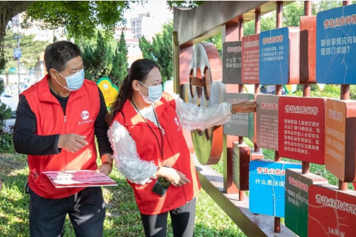 第一站是虎门大宁社区法治公园。在这里,普法志愿者需要进行“《宪法》,我会拼”拼图,即把零散的词语拼接成4句《宪法》的规定。完成拼图后,他们还要参观体验大宁社区法治公园的普法设施,进一步寻找公园内展示的《宪法》知识内容。