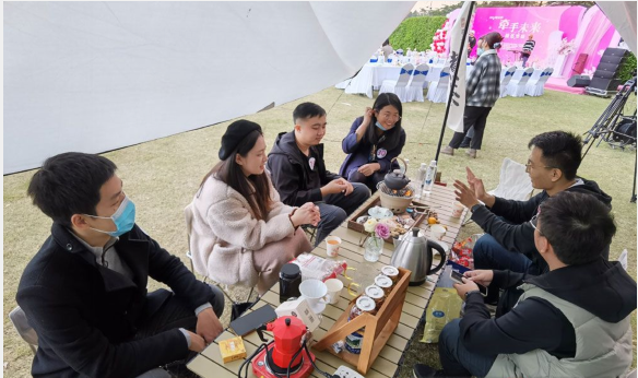 在自由交流时间,嘉宾们围坐在帐篷下,或是围炉煮茶,或是插花画画,或是进行趣味桌游,场面愉快温馨,洋溢着粉红气息。