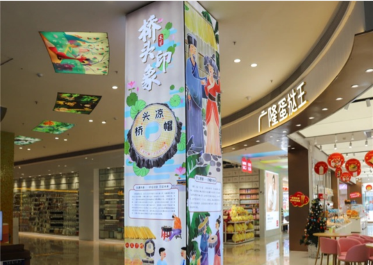 与此同时,近日,桥头文化服务中心和辖区商场合作,在人流密集场所,设置了三个醒目的灯箱公益广告,将传统的非遗内容和桥头文化融入到现代的商场文化中,打造了一个桥头非遗和桥头文化宣传的新窗口,让来自五湖四海的消费者了解桥头文化精髓。