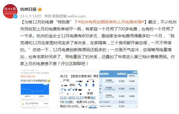 最近,不少杭州市民收到上月的电费账单被吓一跳,有家庭一个月用了700多电费,也有的一个月用了一千多。杭州的金女士12月电费有800多元,是她家全年电费用得最多的一个月,“我觉得和12月在家里时间变多了有关系,在家隔离,三个房间都开着空调,一天不带停的。”总结一下,12月电费创新高原因还挺多的:一方面天气变冷,空调等用电量增加,也有宅家时间多了、用电量涨了的关系,还叠加了年底进入第三档计费等原因。你家上月的电费贵不贵?评论区聊聊吧!