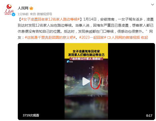 1月14日,安徽淮南,一女子驾车返乡,凌晨到达时发现12名家人站在路边等候。当事人说,因堵车严重且已是凌晨,想着家人都已休息便没有告知自己的位置。抵达时,发现亲戚都在门口等候,很感动也很意外。网友:这就是千里奔赴团圆的意义吧。