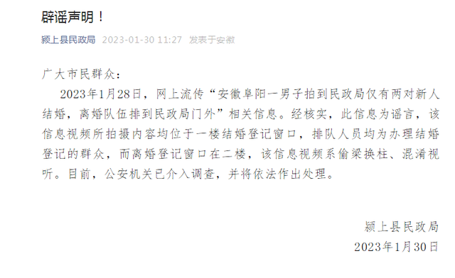 2023年1月28日,网上流传“安徽阜阳一男子拍到民政局仅有两对新人结婚,离婚队伍排到民政局门外”相关信息。经核实,此信息为谣言,该信息视频所拍摄内容均位于一楼结婚登记窗口,排队人员均为办理结婚登记的群众,而离婚登记窗口在二楼,该信息视频系偷梁换柱、混淆视听。目前,公安机关已介入调查,并将依法作出处理。