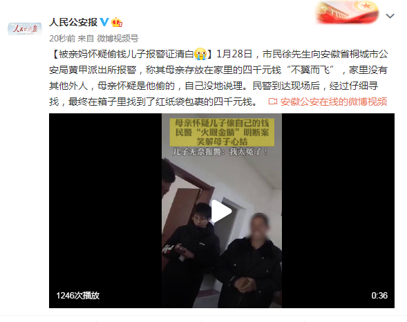 【被亲妈怀疑偷钱儿子报警证清白】1月28日,市民徐先生向安徽省桐城市公安局黄甲派出所报警,称其母亲存放在家里的四千元钱“不翼而飞”,家里没有其他外人,母亲怀疑是他偷的,自己没地说理。民警到达现场后,经过仔细寻找,最终在箱子里找到了红纸袋包裹的四千元钱。