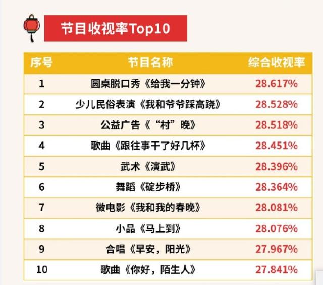 另外,在总台春晚的节目中,圆桌脱口秀《给我一分钟》以28.617%的收视占据首位,少儿民俗表演《我和爷爷踩高跷》、公益广告《“村”晚》、歌曲《跟往事干了好几杯》、武术《演武》、舞蹈《碗步桥》、微电影《我和我的春晚》、小品《马上到》、合唱《早安,阳光》、歌曲《你好,陌生人》等分列2至10位。