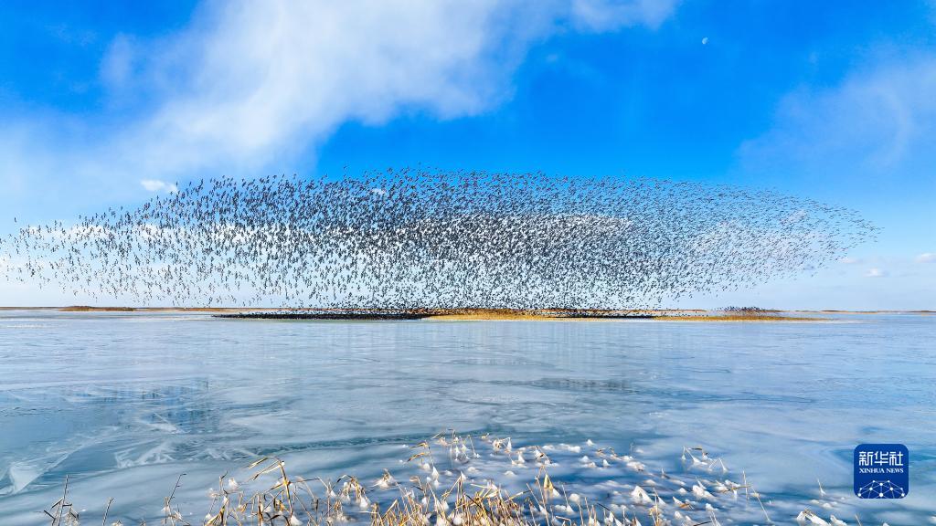 这是2021年12月25日在山东黄河三角洲国家级自然保护区拍摄的鸟群(无人机照片)。新华社发(杨斌 摄)