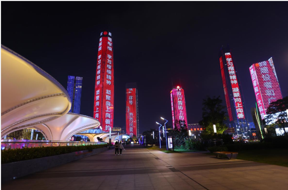 夜色降临,位于市中心的民盈·国贸中心、东莞环球经贸中心、东莞农商银行大厦、东莞嘉宏振兴中心等东莞地标性建筑外墙一道道闪亮的标语照亮夜空。