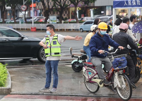 “绿灯时间,行人请通行。”3月27日,在鸿福路与胜和路红绿灯路口斑马线处,一名身着印有“南城志愿者(义工)”字样蓝色马甲的交通文明劝导员和一名身穿绿色马甲的东莞义警,示意机动车停车礼让,行人有序通行。