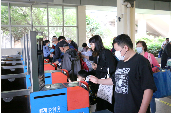 4月4日上午11点01分,香港西九龙开往广州东方向的G6554次列车准点停靠常平站。下车的旅客手持回乡证,携带大包小包有序排队出站。常平站工作人员及志愿者现场为有需要的旅客提供指引,帮助他们快速出站。