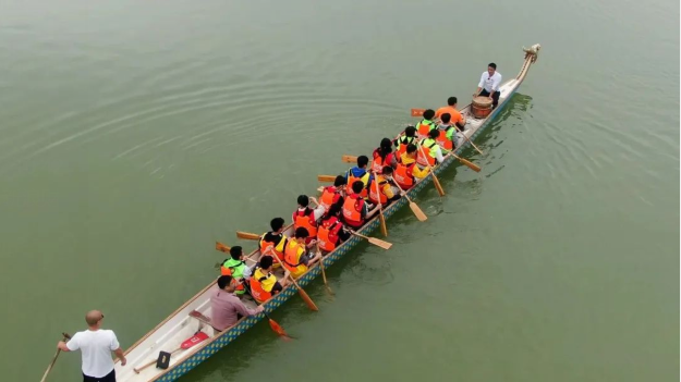 在潢涌老友龙舟俱乐部训练基地,龙舟队员向志愿者和学生介绍了中堂龙舟的历史文化和俱乐部的发展历程及取得的荣誉,让他们进一步了解中堂龙舟的悠久历史和文化底蕴。由专业人员传授划龙舟技巧后,志愿者和学生下水开始水上适应训练,体验划龙舟的乐趣。随着锣鼓声响起,穿戴好安全装备的志愿者和学生齐心协力挥浆前行。河面上水花四溅,一片欢声笑语,虽然不像专业选手般整齐划一,但是大家都很尽情投入,在活动中增强了团队协作的能力,深刻领会“团结拼搏、力争上游”的龙舟精神。