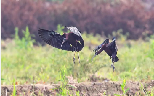 “远看像是平淡无奇的‘黑鸟’,细看它们的羽毛随着身体移动散发五彩光泽,着实让人惊艳!”现场“围观”的鸟类摄影爱好者纷纷惊叹,埋着头不停按下相机快门,记录正在农田中漫步的彩鹮身影。