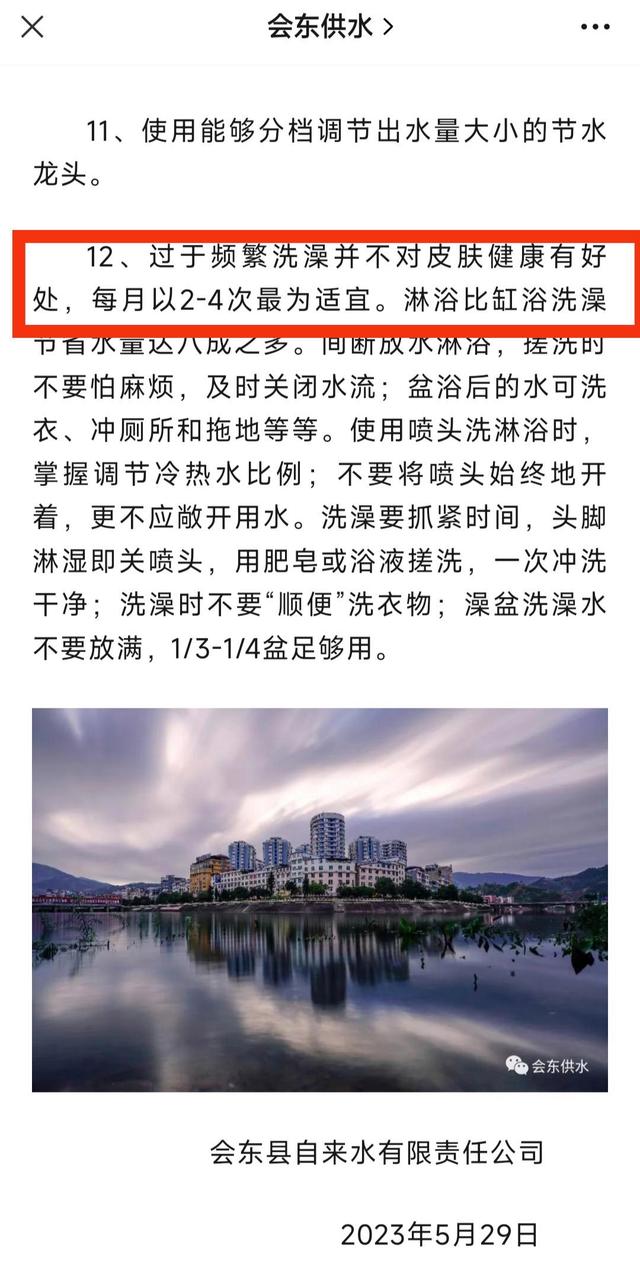 会东县自来水有限责任公司呼吁广大市民节约用水,并分享12条节约用水小窍门给各位用水户。不过,其中的一条“过于频繁洗澡并不对皮肤健康有好处,每月以2-4次最为适宜”引发当地一些市民的关注和热议。