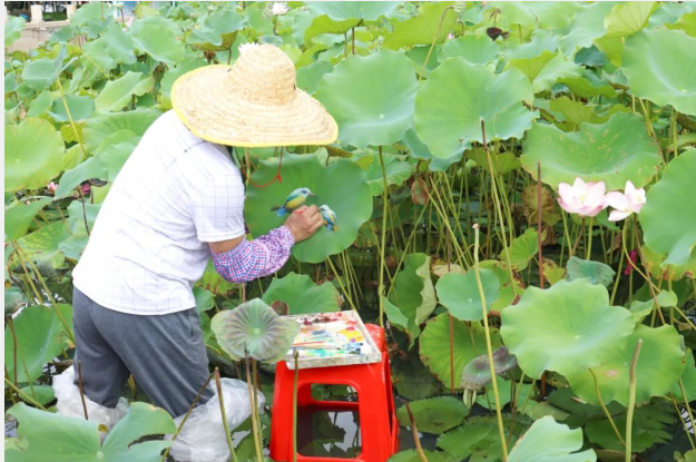 栩栩如生的青蛙、金鱼、小鸟……那一只只惟妙惟肖的小动物“活跃”在荷叶上,让绿叶瞬间充满了生机与活力、增添了趣味。