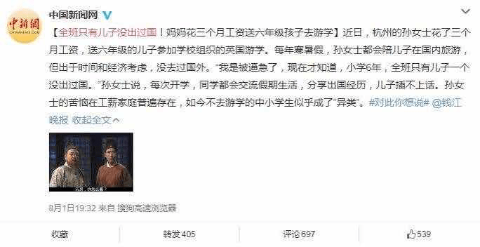 中国新闻网曾经报道,一位母亲因为全班只有自己的儿子没出过国,所以咬咬牙掏出3个月工资送六年级的儿子出国游学。