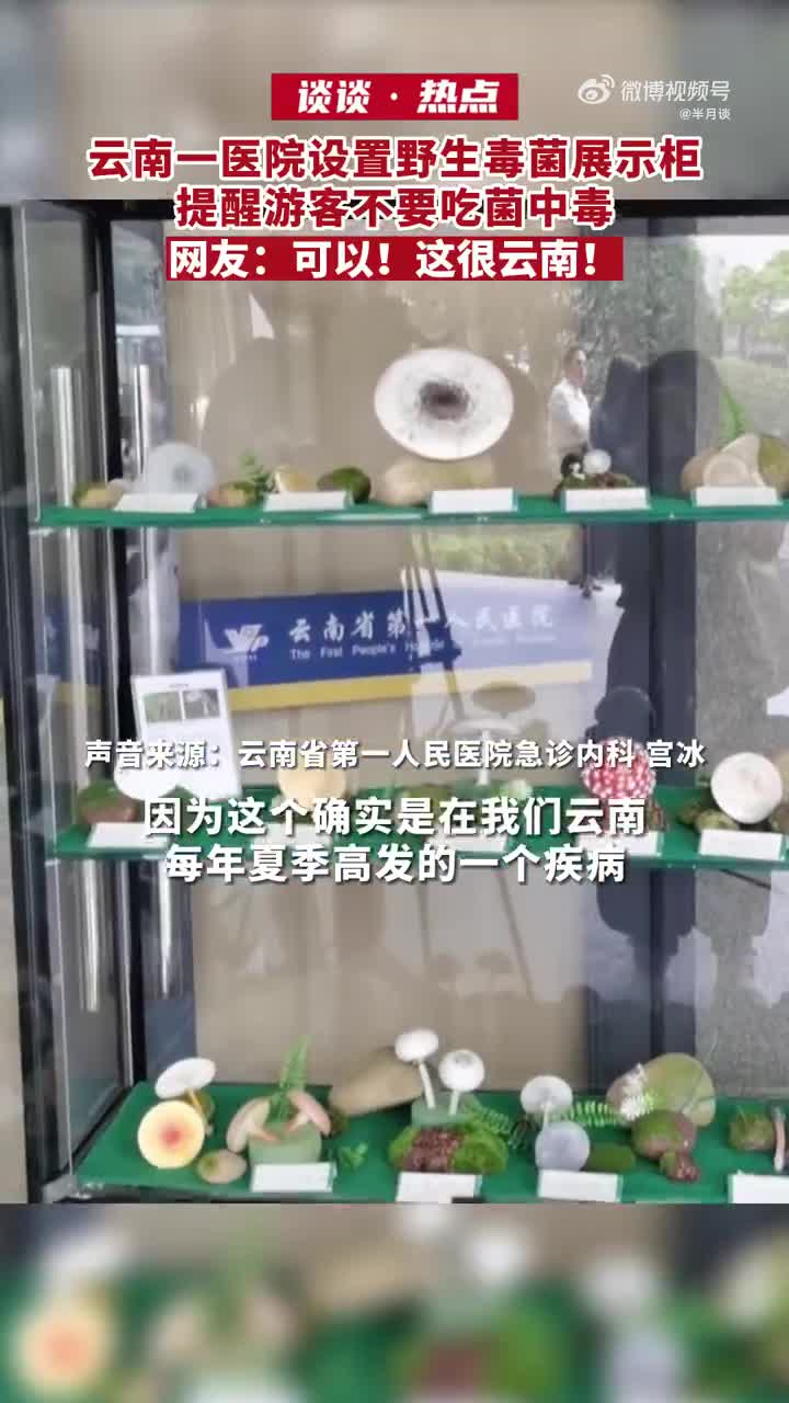 【#云南一医院设置野生毒菌展示柜#】7月27日,云南昆明。一医院在门口放置有毒性的野生菌展柜,该医院的工作人员表示,设置野生毒菌展柜的目的是告诉外地游客,这些菌有毒不能食用,其次也是告诉云南老铁,不能吃的野生菌千万不要吃。工作人员介绍:全球可食用的野生菌有2500种,中国占了1000种,在云南就有900种,约占全球可食用野生菌的36%,中科院发布的易混淆的野生毒菌有24种,展柜展出了近30种野生毒菌。