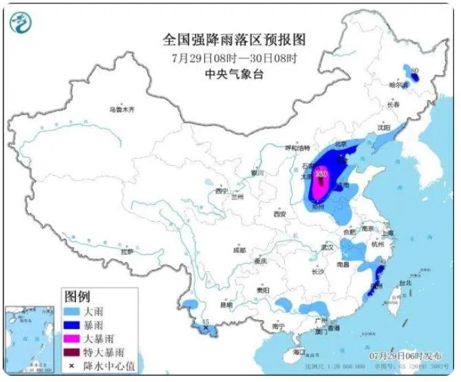 预计,7月29日08时至30日08时,河北大部、北京、天津、山东中西部、河南中北部、辽宁东部以及黑龙江中南部、安徽北部和西南部、江西东北部、浙江南部、福建东部、云南西南部等地部分地区有大到暴雨,其中,河北南部、河南北部、山西东南部等地部分地区有大暴雨,河北南部等地局地特大暴雨(250~260毫米)。上述部分地区伴有短时强降水(最大小时降雨量30~60毫米,局地可超过80毫米),局地有雷暴大风等强对流天气。