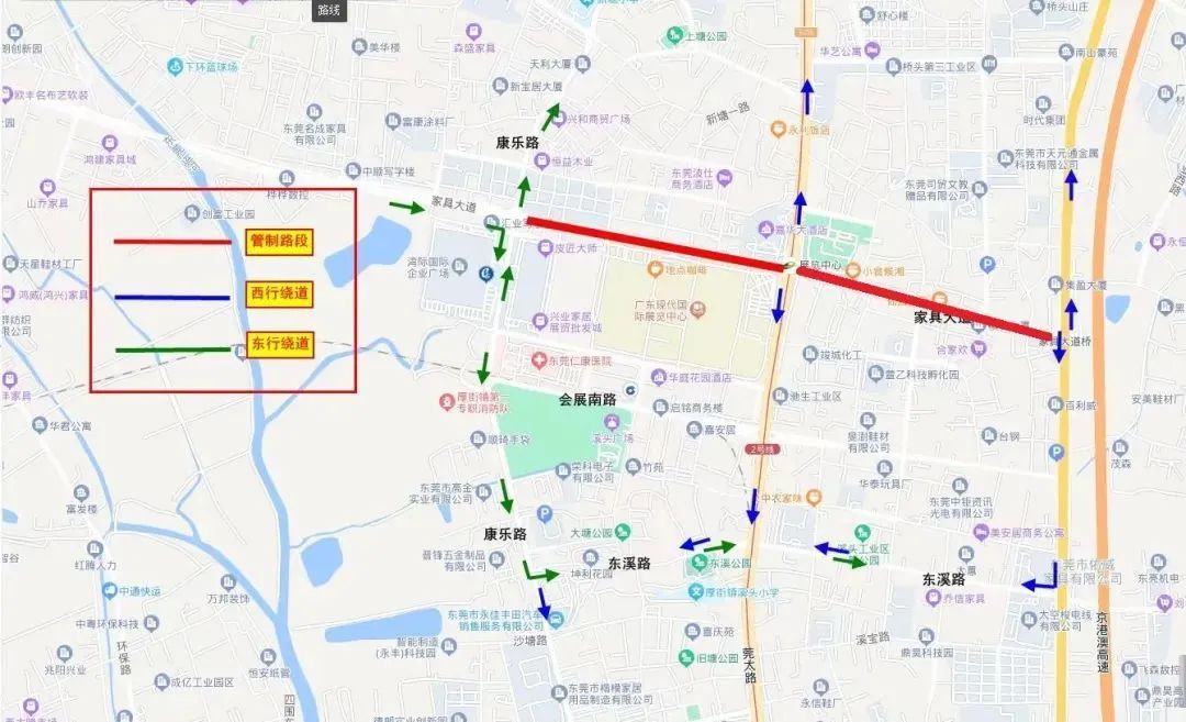 家具大道(康乐南路至环莞快速),禁止所有危险化学品运输车辆及核载4.5吨以上的货车在上述时间驶入管制区域。