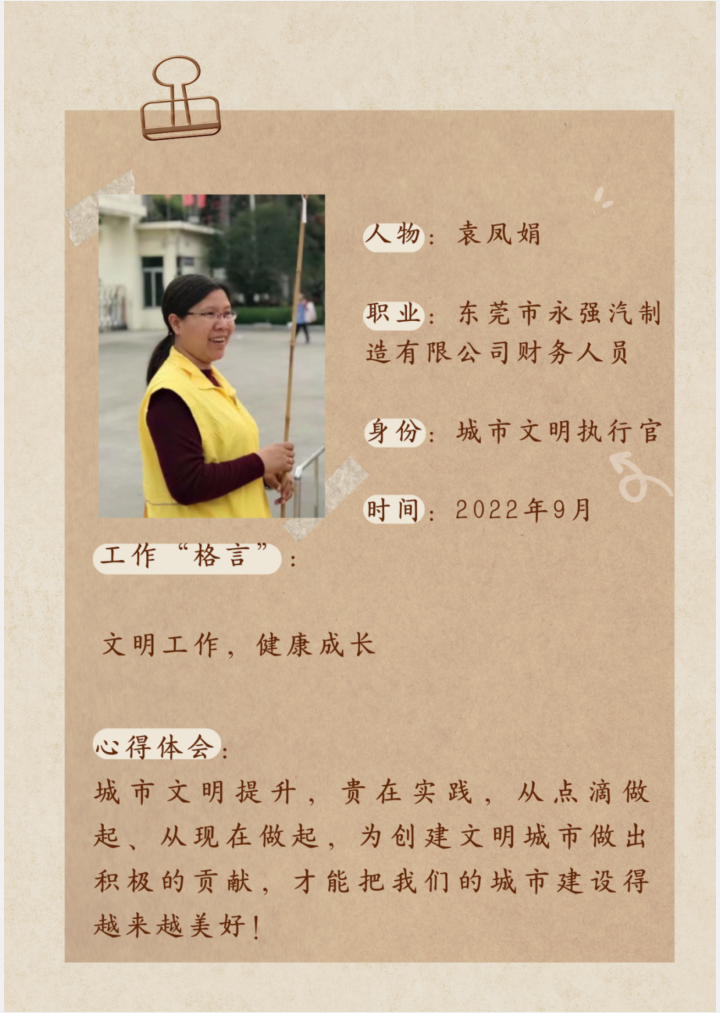 袁凤娟是东莞城市文明执行官之一,自2022年9月担任城市文明执行官以来,她一直积极组织开展一系列文明礼仪推广志愿服务,用实际行动示范带动身边更多的同事、亲朋好友参与文明实践,养成文明礼貌的行为习惯。