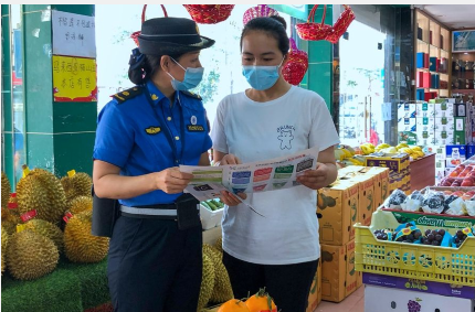 “这个门前要三包,你看这个责任牌已经贴在这里了,包整洁、包秩序、还有包绿化,还有这个箱子,不可以放这里,你这个是占地了……”耐心地对商铺宣传“门前三包”和“垃圾分类”,“五一”期间,桥头城管人每天监管和维护镇内的市容环境卫生,倡导商户自觉遵守、共同维护好整洁有序的城市环境。