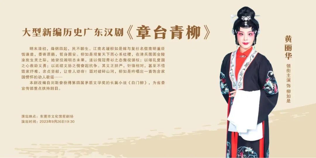 广东汉剧《章台青柳》是广东省委宣传部扶持的重点剧目之一,是广东省戏剧家协会与广东汉剧传承研究院联合组织创排的一台舞台艺术精品。该剧取材于著名作家刘斯奋第四届茅盾文学奖同名获奖长篇小说。讲述了明朝末年“女侠名姝”柳如是的传奇人生。