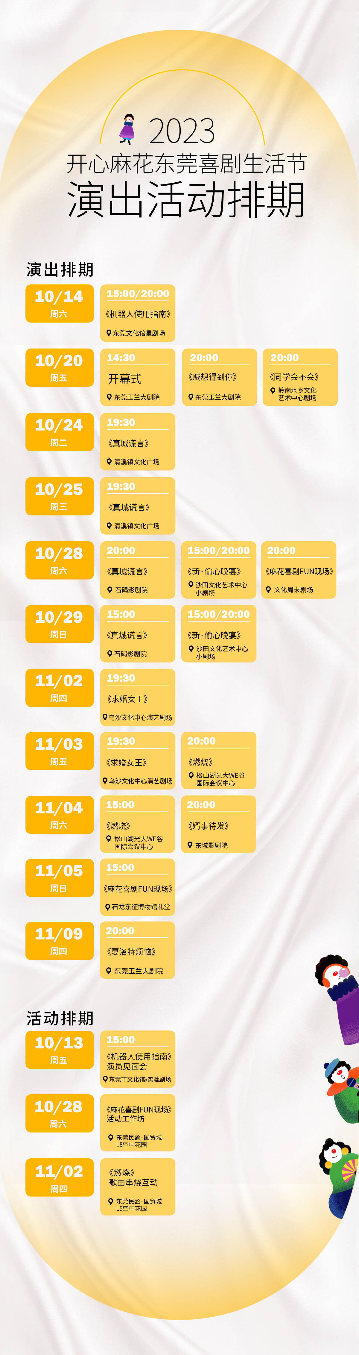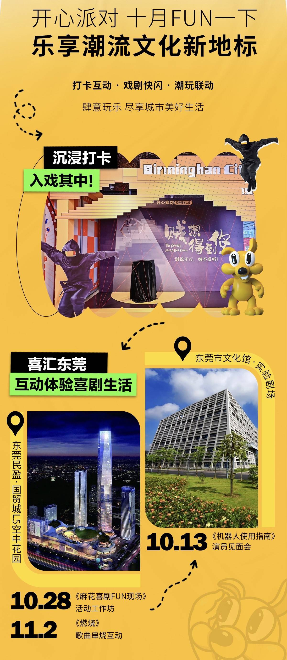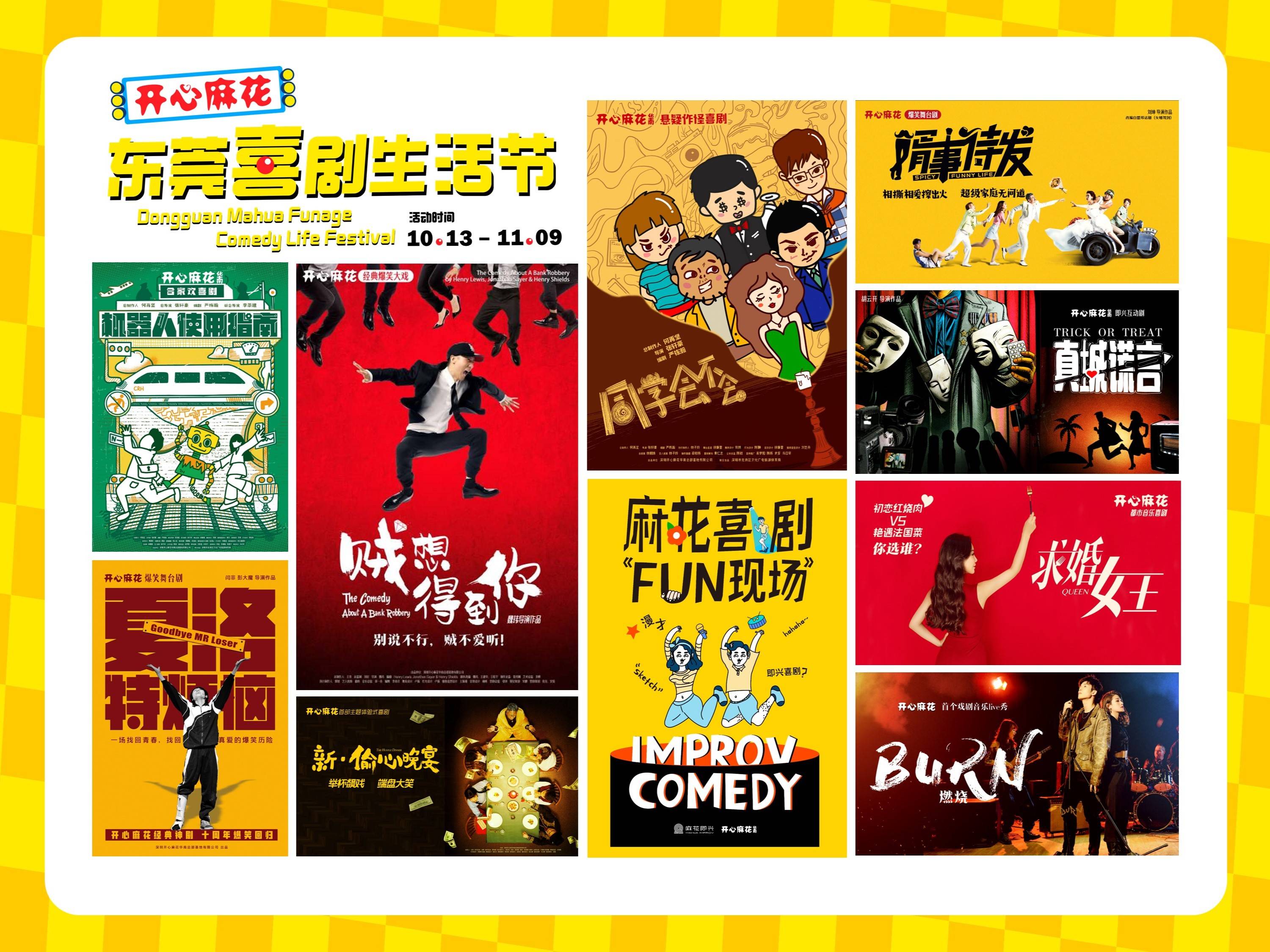 从10月13日至11月9日,王牌爆笑舞台剧、主题体验式互动喜剧、即兴喜剧、音乐戏剧live秀等形式新颖的10部精品剧目、20多场精彩演出活动,将在为期28天的喜剧生活节期间走进11座大剧院与小剧场,演出地点分布在东莞多个镇街,旨在输出潮流与价值兼备的喜剧作品,用精品好戏助力东莞魅力文化强市建设。