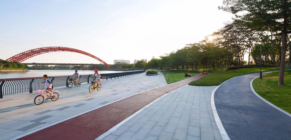 在这个区域,滨水慢步道、跑步道、骑行道“三线”贯通,曲海大桥慢行坡道、东莞水道特大桥慢行坡道,新增人行桥建设。为市民提供通达、安全、舒适的滨江慢行环境,满足公众漫步、跑步、休闲骑行等多种活动。一抹蜿蜒灵动的红色,盘旋在生态底色与跨江桥之间,与大桥交相呼应。
