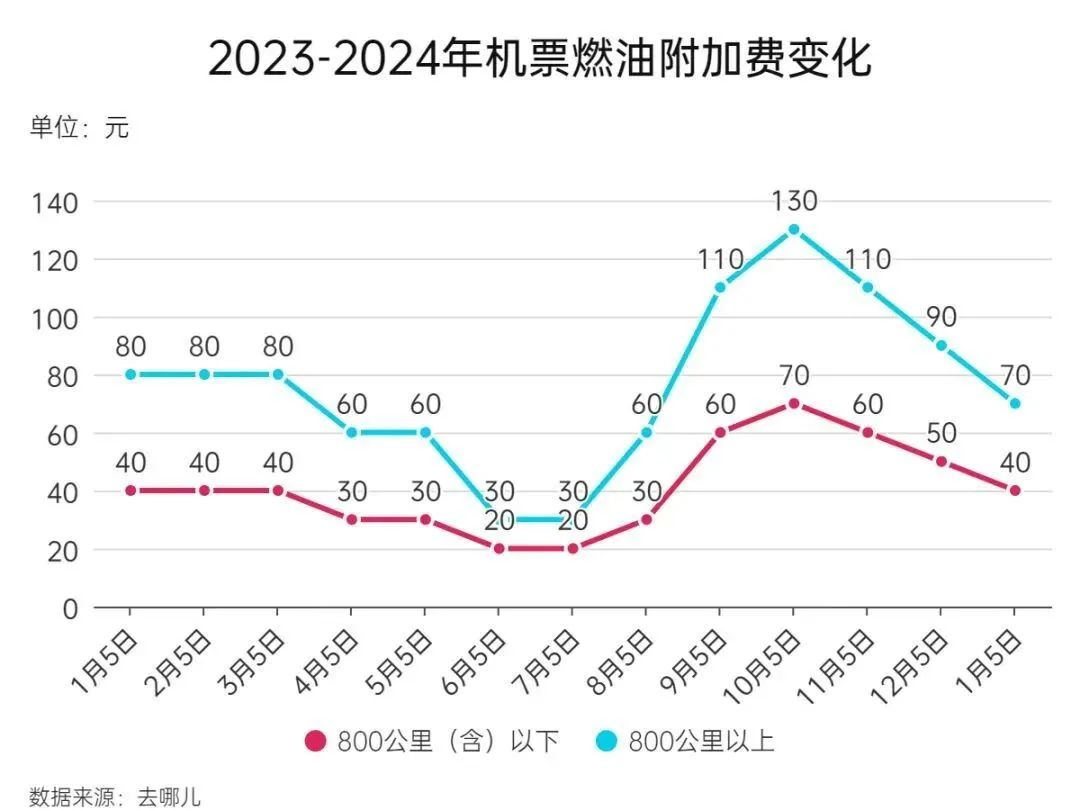 自2024年1月5日(出票日期)起,成人旅客:800公里(含)以下航线每位旅客收取40元燃油附加费,800公里以上航线每位旅客收取70元燃油附加费。相较于调整前分别降低了10元和20元,机票燃油附加费连续三个月下降。