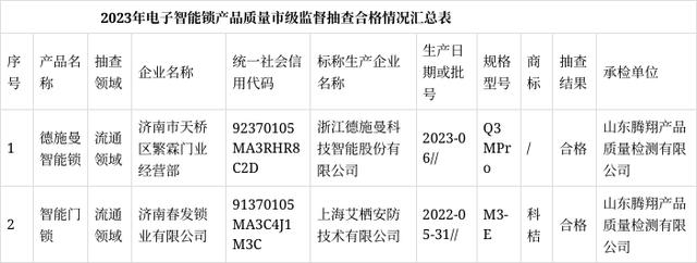 2023年第一批电子智能锁产品质量市级监督抽查公布