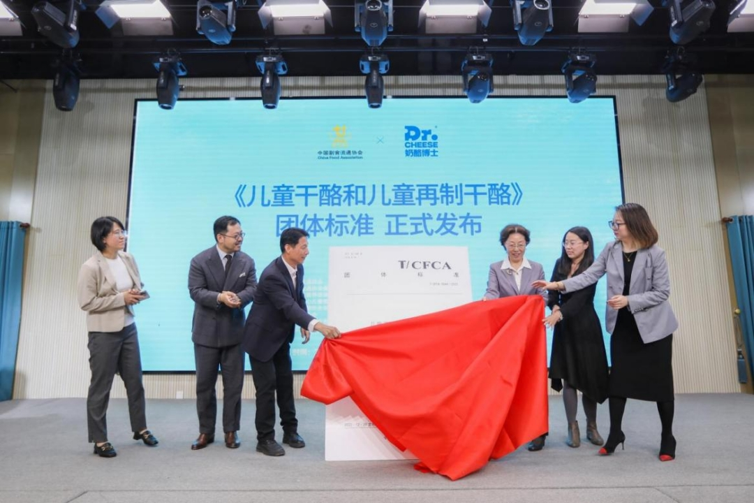 中国副食流通协会会长何继红,北京农学院教授、中国副食流通协会食育与健康产业分会副会长仝其根,教育部全国学校食品安全与营养健康工作专家组秘书长/中国农业大学食品科学与营养工程学院教授车会莲,北京工商大学食品与健康学院副教授李妍,京东集团-京东零售-大商超事业部-洁护母婴业务部采销经理黄晓巍,奶酪博士创始人兼CEO陈昱桦共同发布了行业《儿童干酪和儿童再制干酪》团体标准。