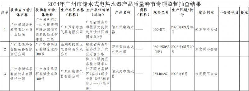 近日,广州市市场监督管理局对储水式电热水器产品质量进行了专项监督抽查,共抽查了3批次样品,经检验,未发现不合格。