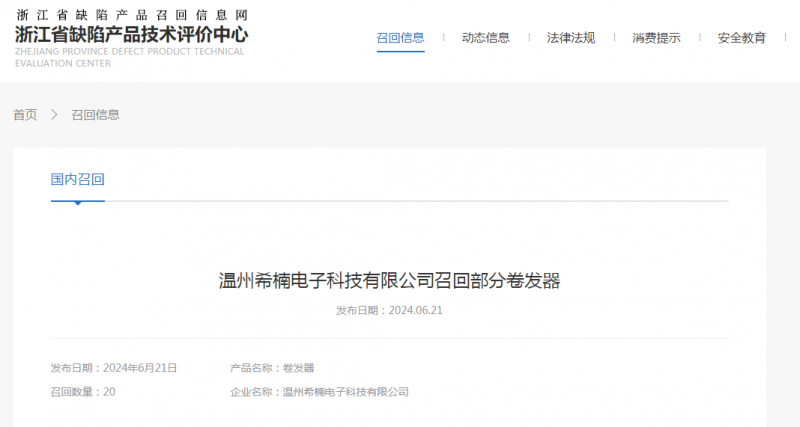 日前,温州希楠电子科技有限公司受缺陷调查影响按照《消费品召回管理暂行规定》的要求,主动向浙江省市场监督管理局和温州市市场监督管理局报告了召回计划,将自即日起,召回2022年6月28日制造的XN-828型号卷发器,涉及数量为20台。