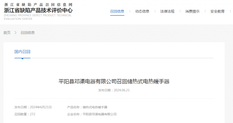 日前,平阳县邓渠电器有限公司受缺陷调查影响按照《消费品召回管理暂行规定》的要求,主动向浙江省市场监督管理局和温州市市场监督管理局报告了召回计划,将自即日起,召回2022年08月23日制造的规格型号为YS203的储热式电热暖手器,涉及数量为272件。
