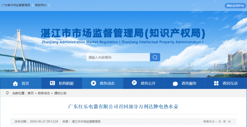 日前,广东红乐电器有限公司按照《消费品召回管理暂行规定》的要求,主动向湛江市市场监督管理局报告了召回计划,将自即日起,召回2022年11月03日至2022年11月04日期间制造的部分万利达牌HL1523A-05C型号电热水壶,涉及数量为1040台。