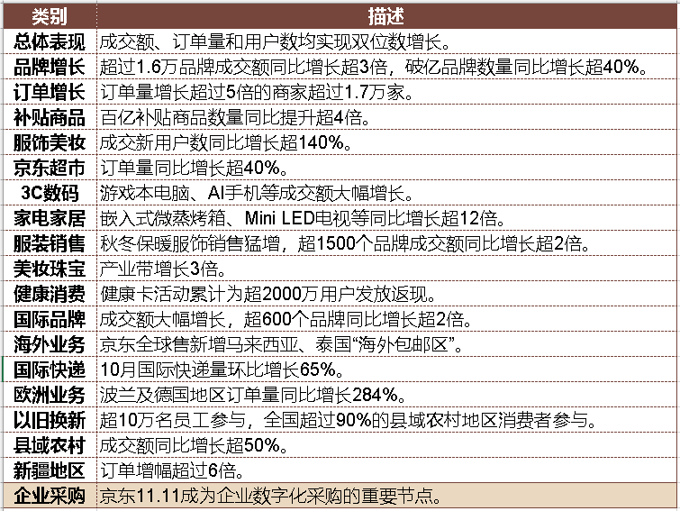 在刚刚过去的京东11.11购物狂欢节中,京东再次实现了成交额、订单量和用户数的双位数增长。这场购物盛宴由京东通过加倍补贴和精选大牌爆品打造,以极具吸引力的价格和商品,以及卓越服务,为消费者带来了一场优质购物体验。