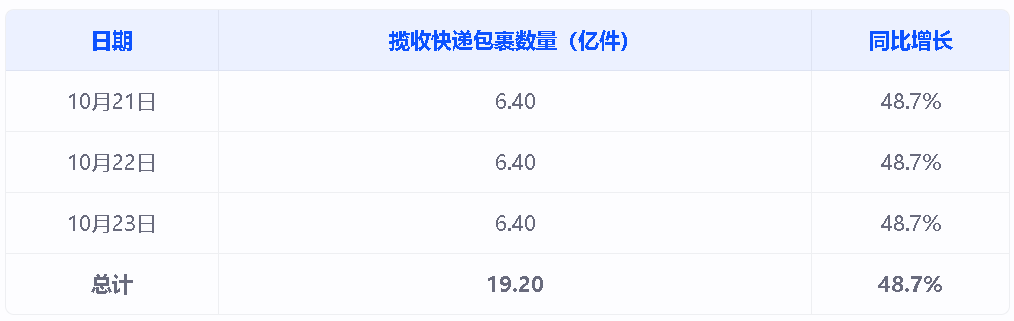 从快递员的工作量可以看出,双十一期间的工作强度大幅增加。北京的一位快递小哥表示,平时六七点就能送完的快递,在双十一高峰期要工作到夜里十一点甚至更晚。北京市朝阳区一顺丰网点负责人也指出,双十一第一波小高潮里,网点日均揽件量比去年双十一多了50%。宏观数据同样显示,全国邮政快递业在10月21日至23日期间共揽收约19.20亿件快递包裹,较去年同期增长48.7%。