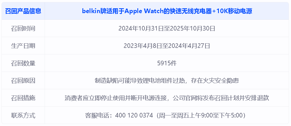 贝尔金贸易(上海)有限公司宣布,自2024年10月31日起至2025年10月30日,将召回2023年4月8日至2024年4月27日生产的belkin牌适用于Apple Watch的快速无线充电器+10K移动电源,共计5915件。此次召回的原因是制造缺陷可能导致无线电池充电器中的锂电池组件过热,从而存在引起火灾的安全隐患。