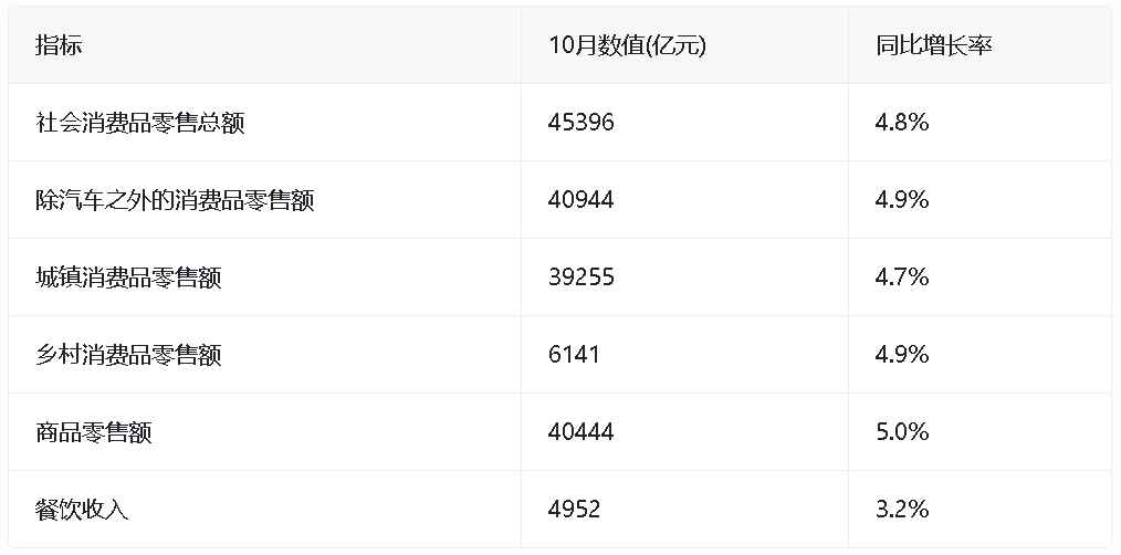 具体来看,10月份除汽车之外的消费品零售额为40944亿元,同比增长4.9%。这一增速较上月有所提升,显示出消费者在非汽车类商品上的支出持续增加。从全年来看,1-10月份社会消费品零售总额累计达到398960亿元,同比增长3.5%,其中除汽车以外的消费品零售额为359039亿元,增长3.9%。