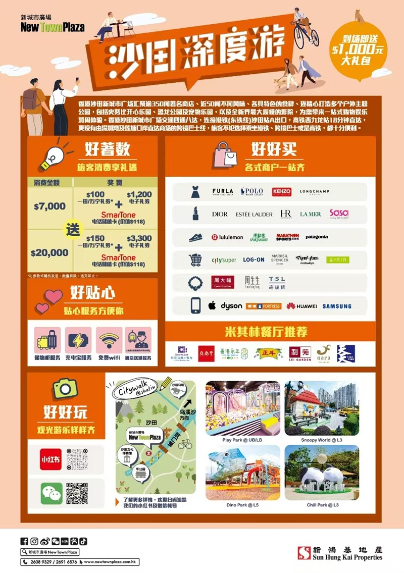 新鸿基地产的旗舰商场,集餐饮购物、休闲及娱乐于一身。商场由一期及三期组成,连同全港最大家居商场HomeSquare总面积约20万平方米,成为全港最大商场之一。商场汇聚逾350间著名商店、近50间不同风味、各具特色的食肆、恐龙公园、史努比乐园等多个主题乐园以及全新界最大规模的影院,为您带来多姿多彩的一站式购物娱乐消闲新体验。商场位于沙田区核心区域,港铁(东铁线)沙田站A出口直达,更设有由深圳湾及莲塘口岸直达商场的跨境巴士线,交通四通八达,旅客不论选择乘坐港铁、跨境巴士或是高铁,都十分便利。