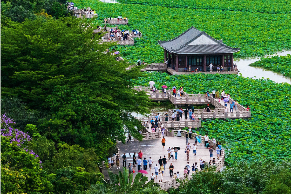莲湖千亩荷塘的粉白花苞尚未完全舒展,桥头镇文旅市场的消费曲线已强势上扬。作为粤港澳大湾区罕有的复合型生态文旅目的地,这座"中国荷花名镇"通过精准嫁接生态IP与消费场景,在传统旅游旺季中构建出立体化体验矩阵。监测数据显示,5月1-5日全镇三大核心景区累计接待量突破3万人次,夜间消费环比增长210%,形成农文旅深度融合的"现象级"破圈效应。